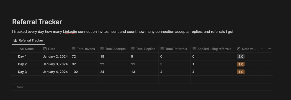 Since early this year, I applied to 21 jobs, I sent over 180 Linkedin invites, and got 18 referrals. I made this job tracker and referral tracker to keep me disciplined and to track status.