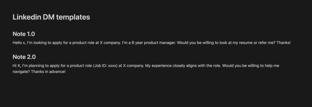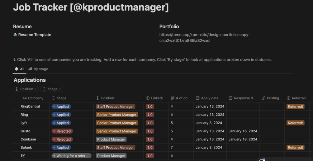 Since early this year, I applied to 21 jobs, I sent over 180 Linkedin invites, and got 18 referrals. I made this job tracker and referral tracker to keep me disciplined and to track status.